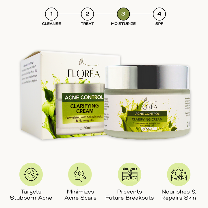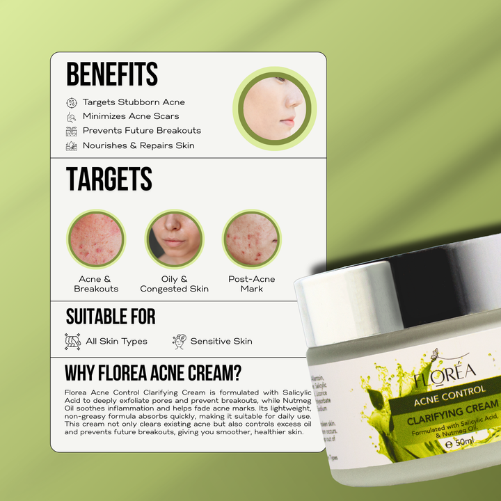 Florea Acne Control Clarifying Cream is a targeted treatment designed to combat acne and blemishes. Formulated with Salicylic Acid & Nutmeg Oil, it deeply penetrates pores to unclog and reduce breakouts, while Nutmeg Oil soothes inflammation. This cream helps clear acne-prone skin, promoting a smoother, clearer complexion with regular use. Ideal for oily skin, it provides effective, gentle care without dryness or irritation.