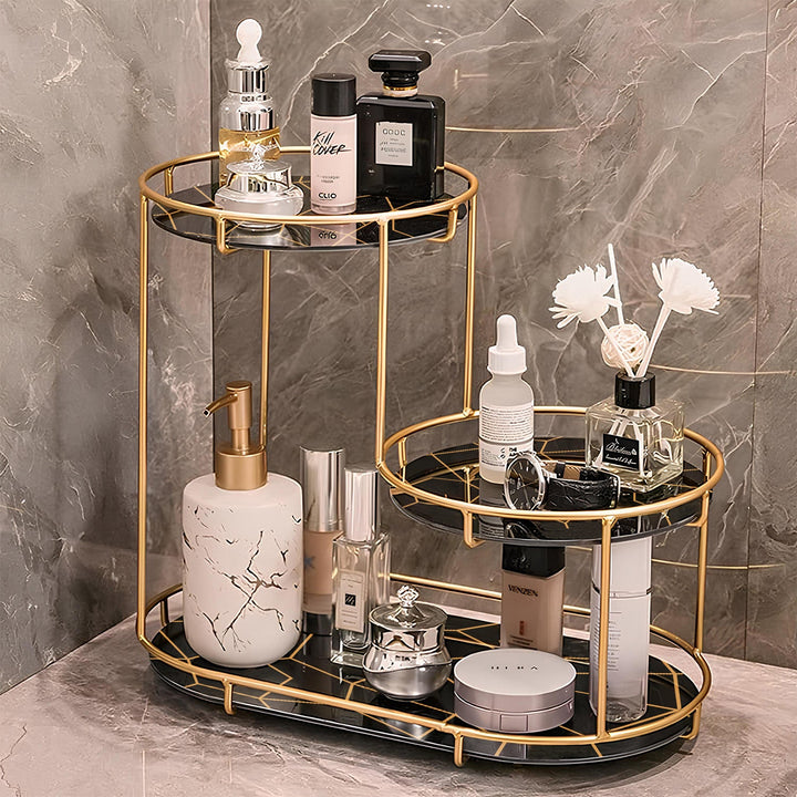 This 3-Tier Golden Vanity Stand by Matrix provides ample vertical storage, maximizing organization in a compact footprint. It features a sophisticated gold metal frame and tiered shelves with a marble-patterned surface, creating a visually appealing display for your cosmetics and toiletries. The open design allows for easy visibility and access to all your stored items, making it a perfect addition to any bathroom or vanity.