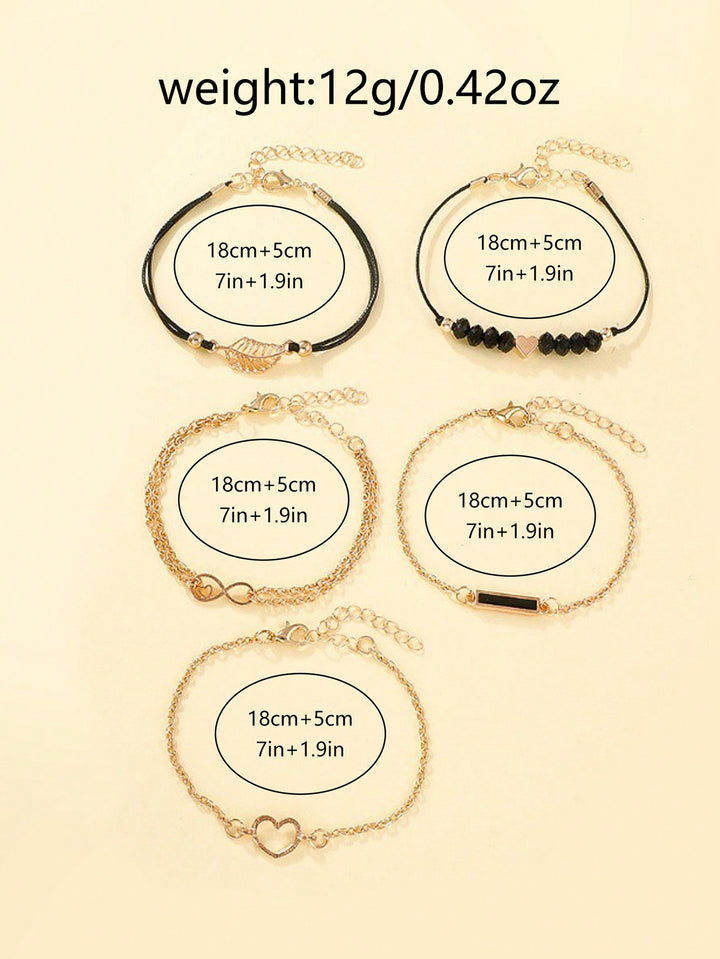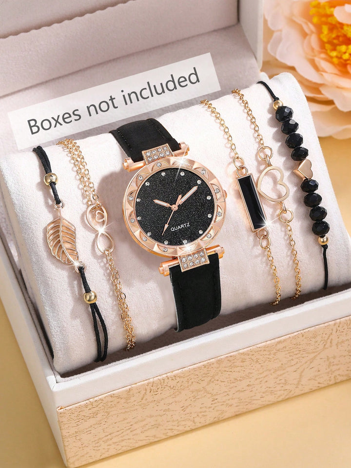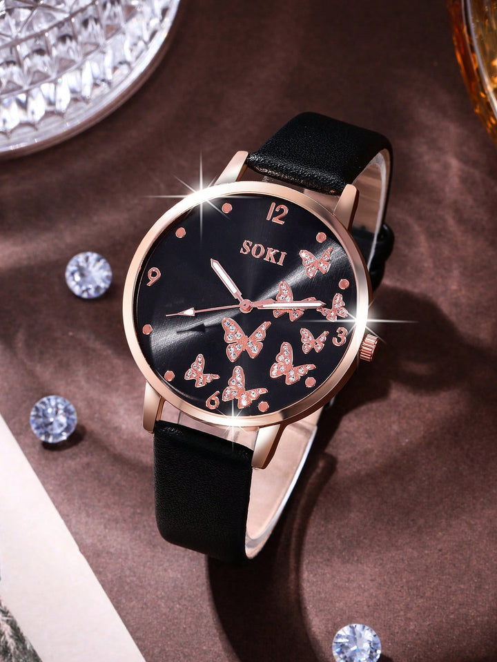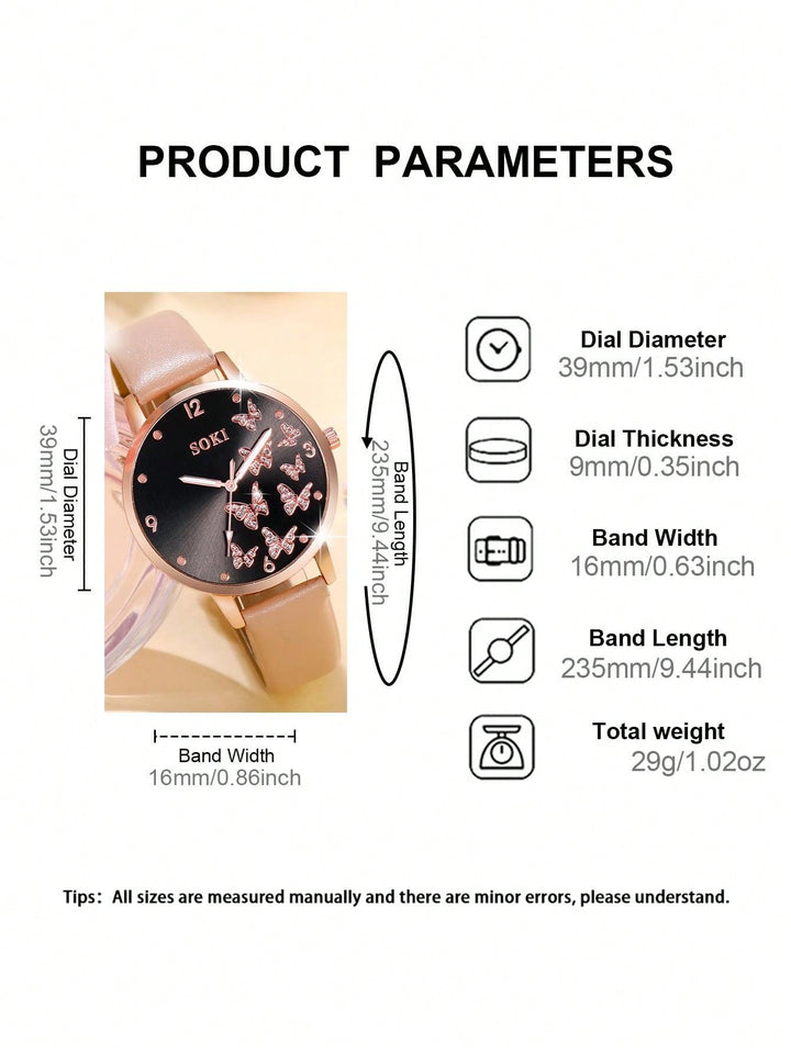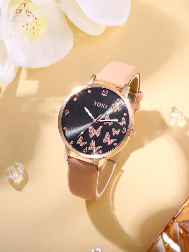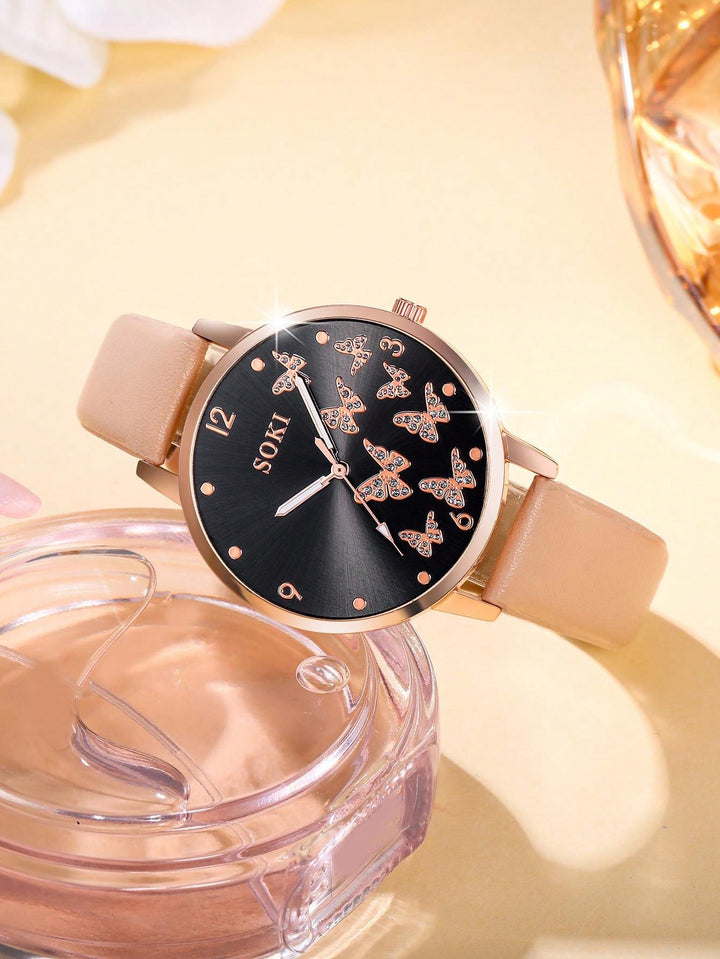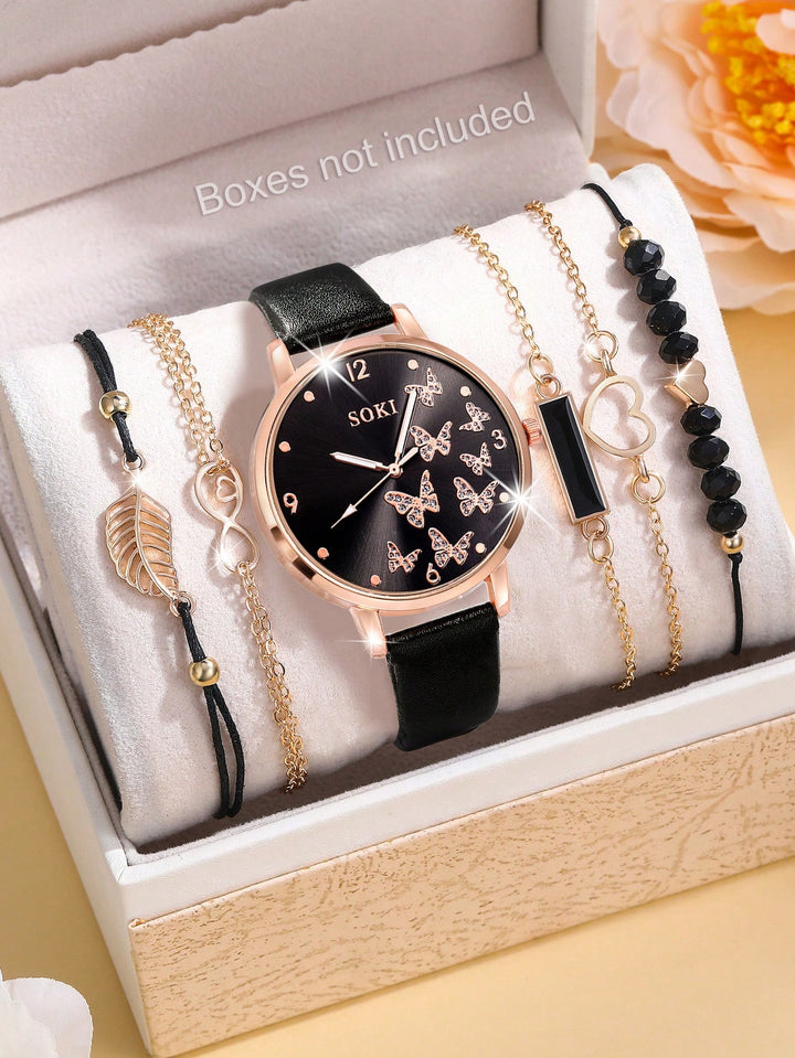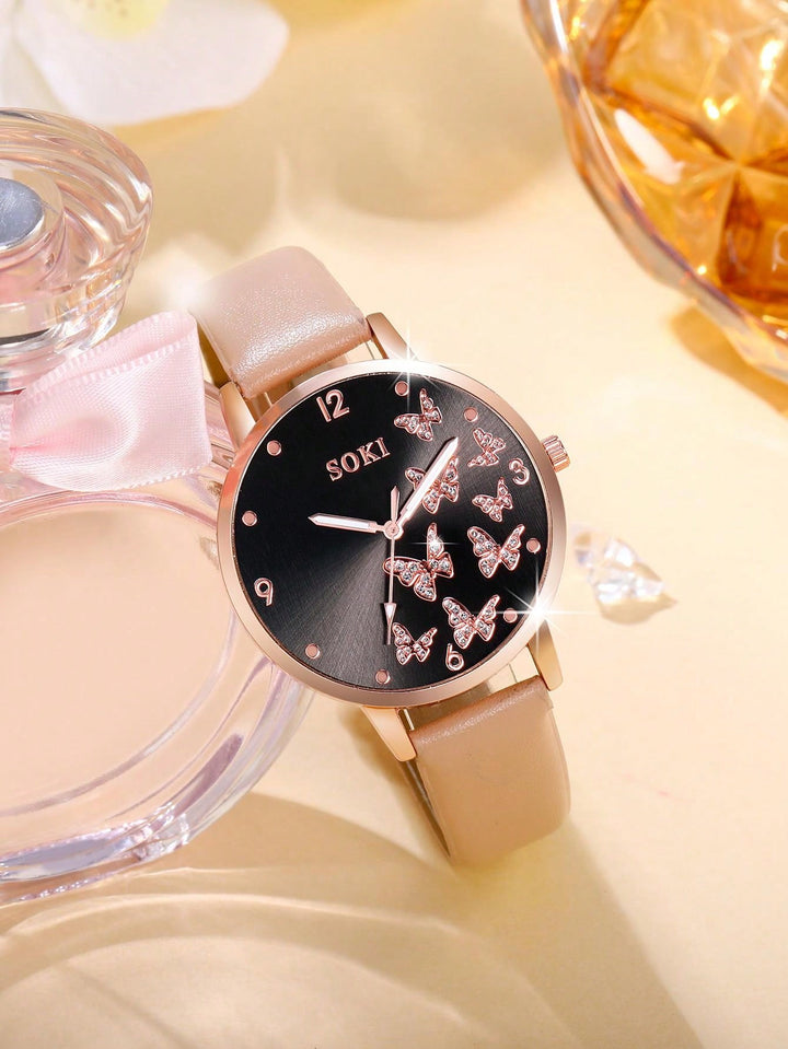 Shein - 1pc Ladies' Simple Quartz Watch With Beige Pu Strap & Butterfly Printed Dial, And 5pcs/set Bracelet Accessory Kit