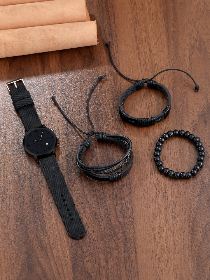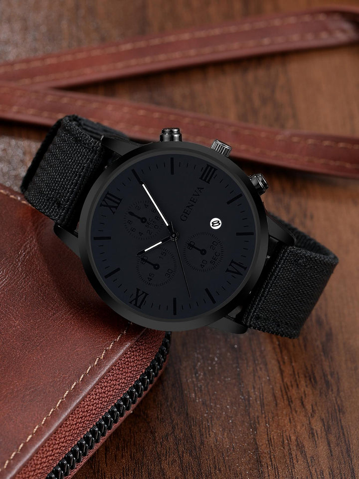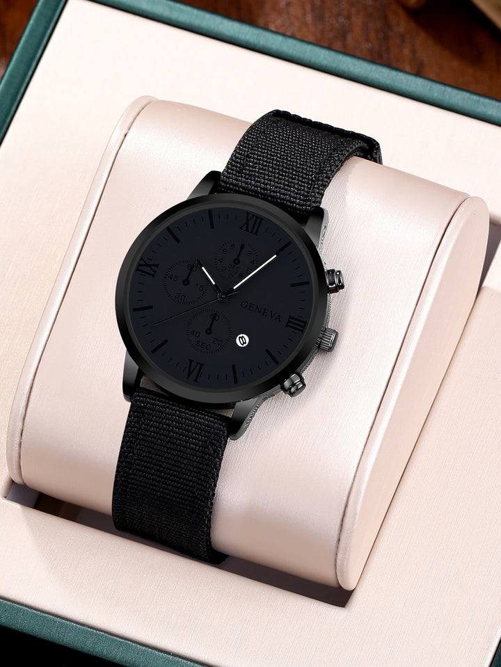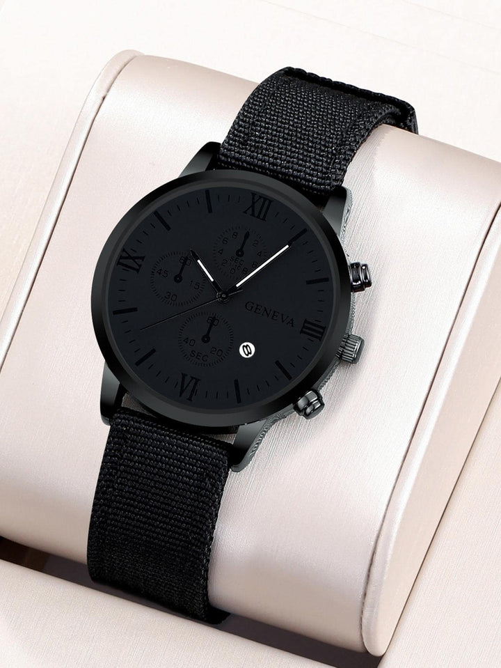 Shein - 1pc Men's Black Sports Round Calendar Indicator Quartz Watch With Nylon Strap And 3 Bracelets