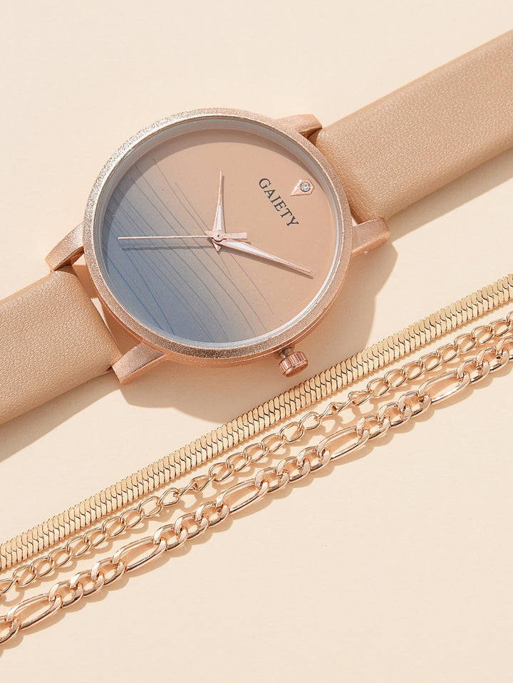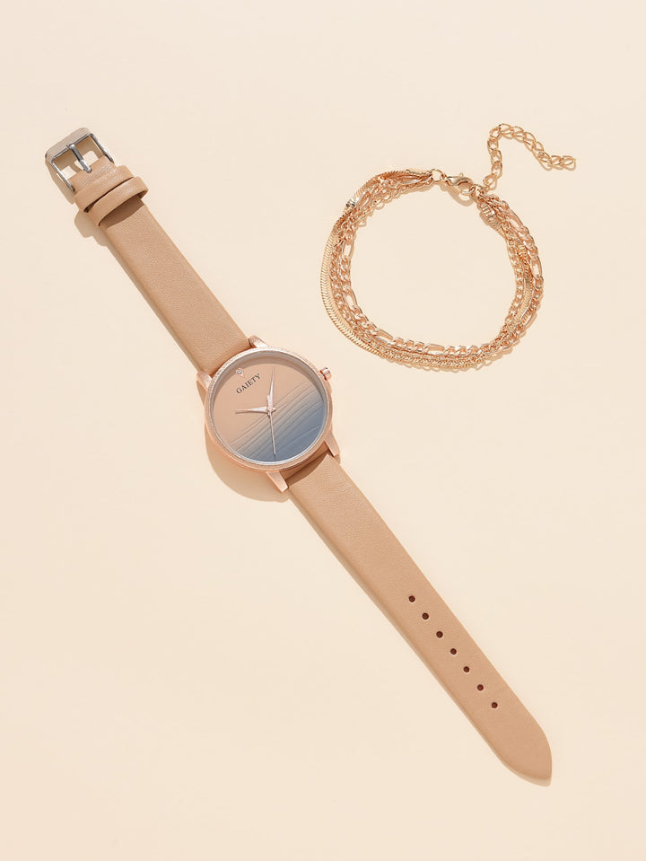 Shein - 1pc Ombre Round Pointer Quartz Watch & 1pc Layered Bracelet