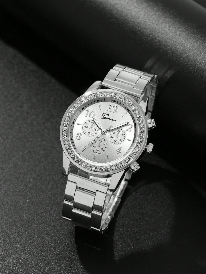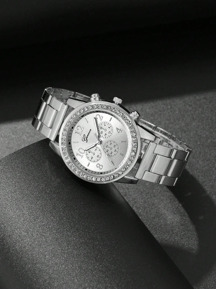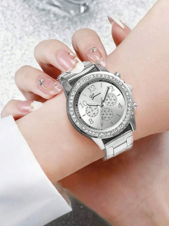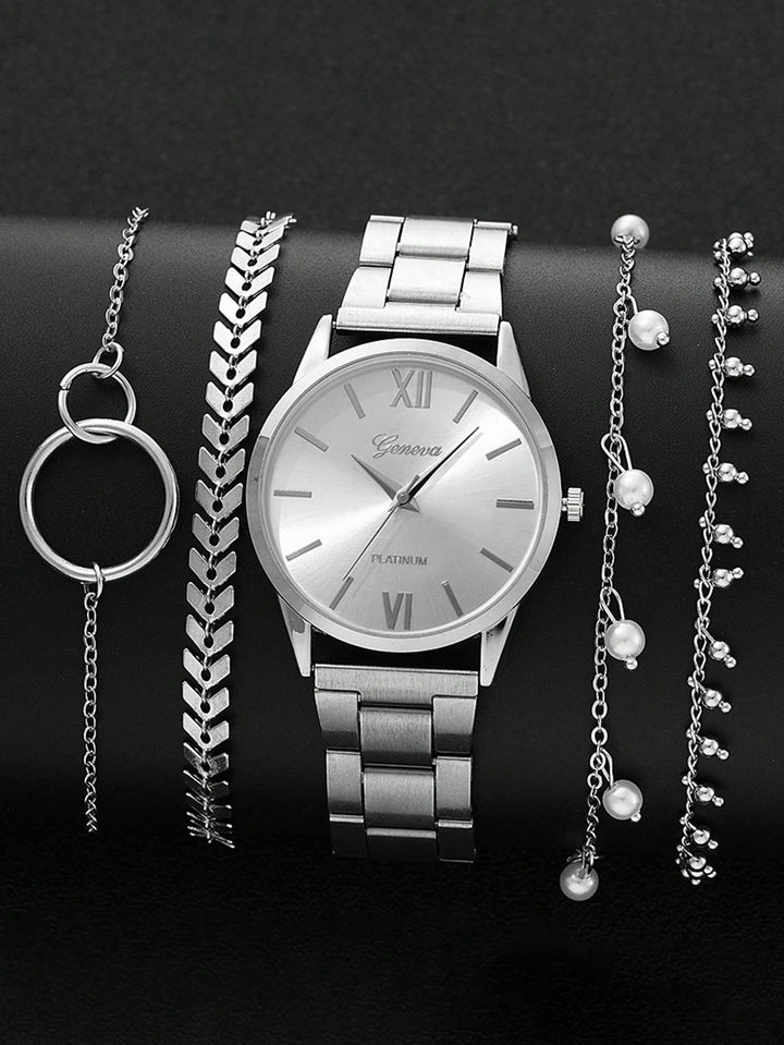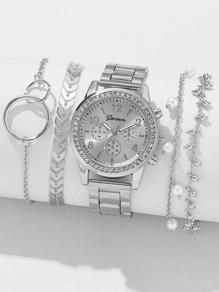 Shein - 1pc Rhinestone Decor Quartz Watch & 4pcs Bracelet