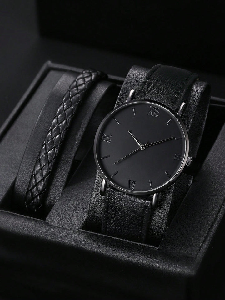 Shein - 2pcs/set Men's Casual Black Quartz Watch And Bracelet