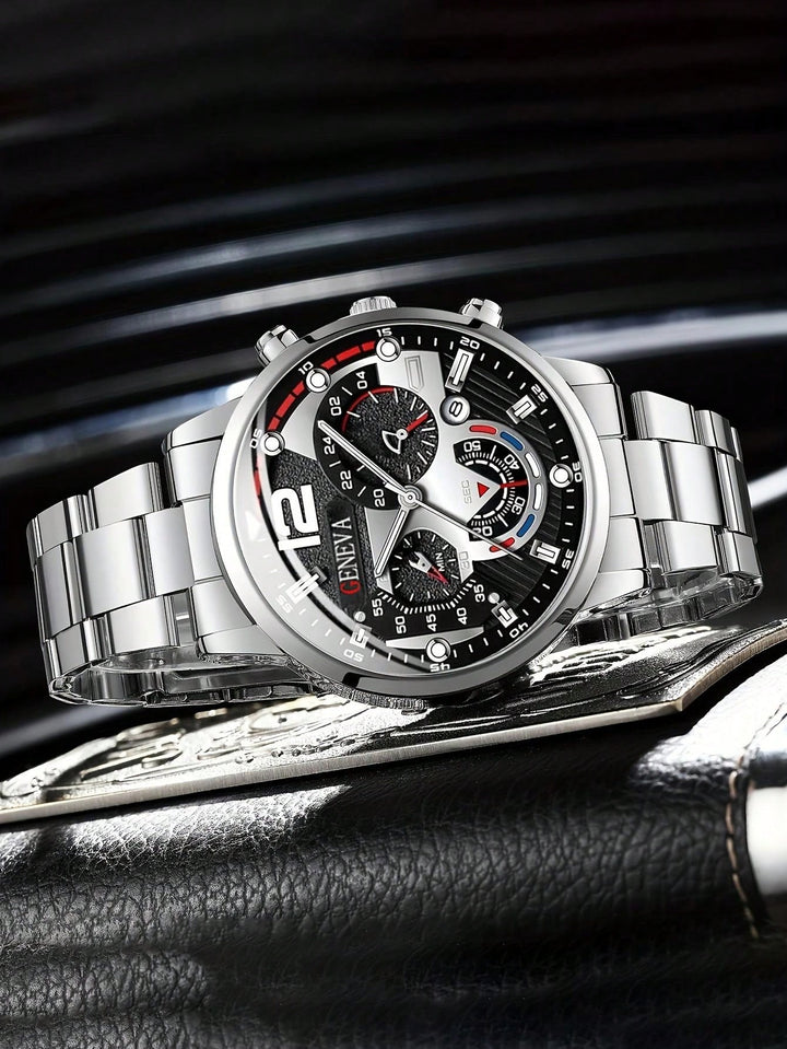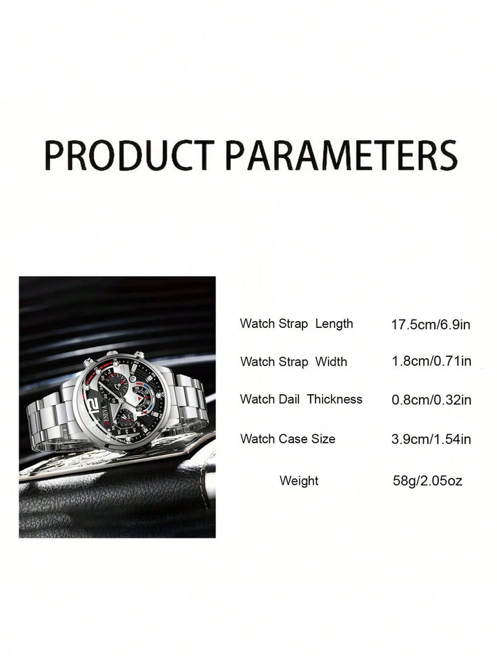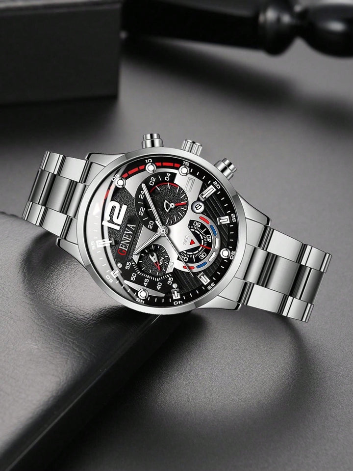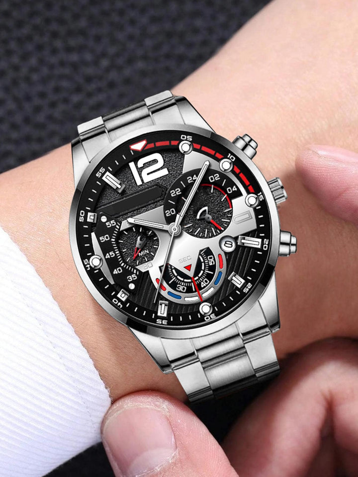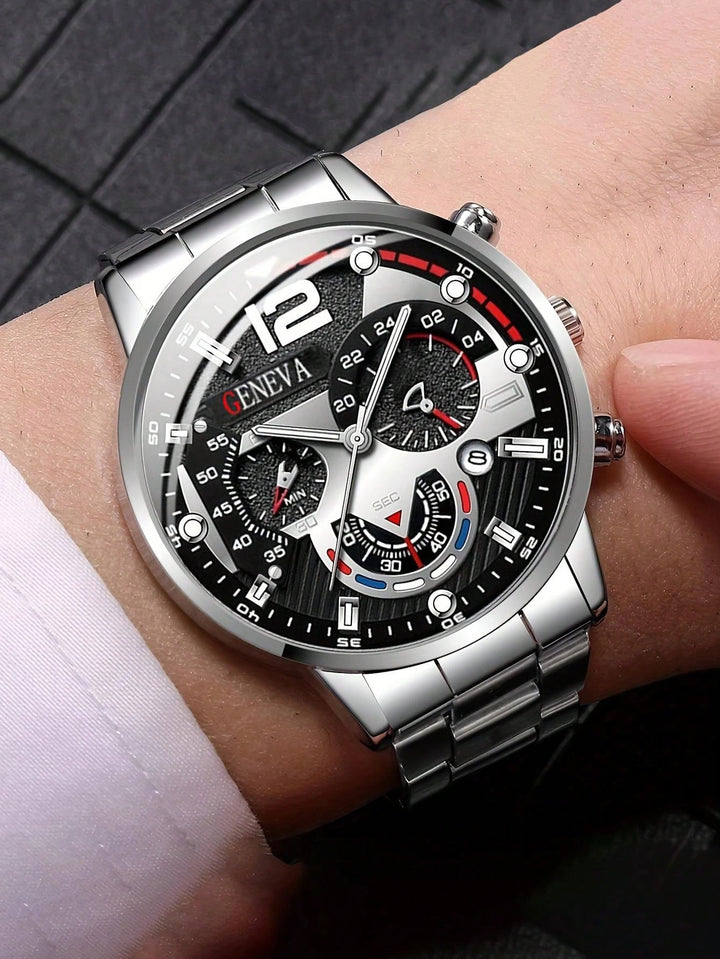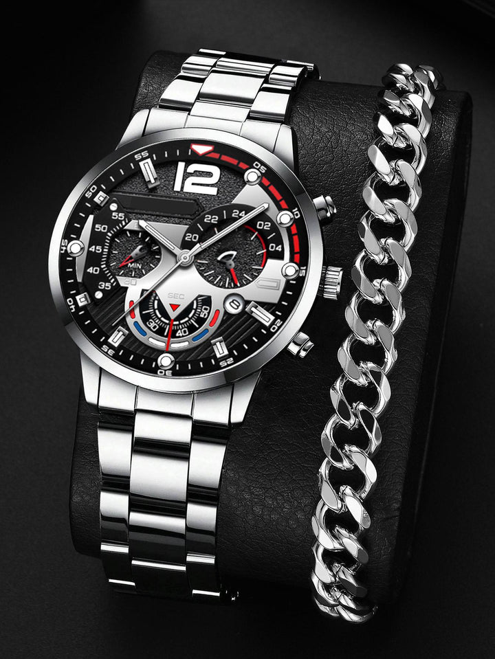 Shein - 2pcs/Set Men's Stainless Steel Quartz Watch Business Fashion Wristwatch With Gold Chain Bracelet, Date Feature