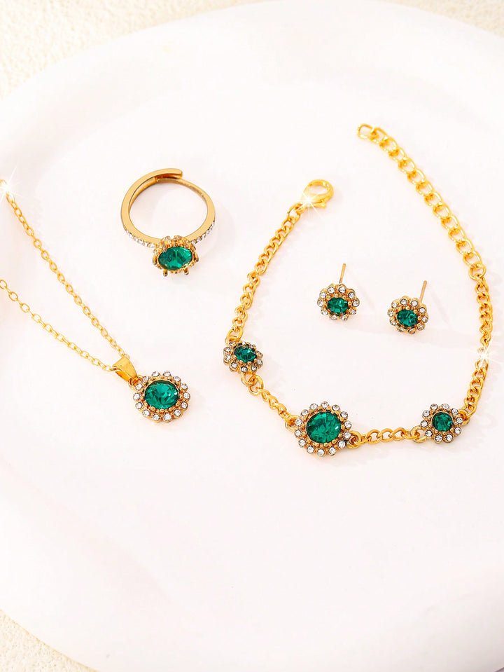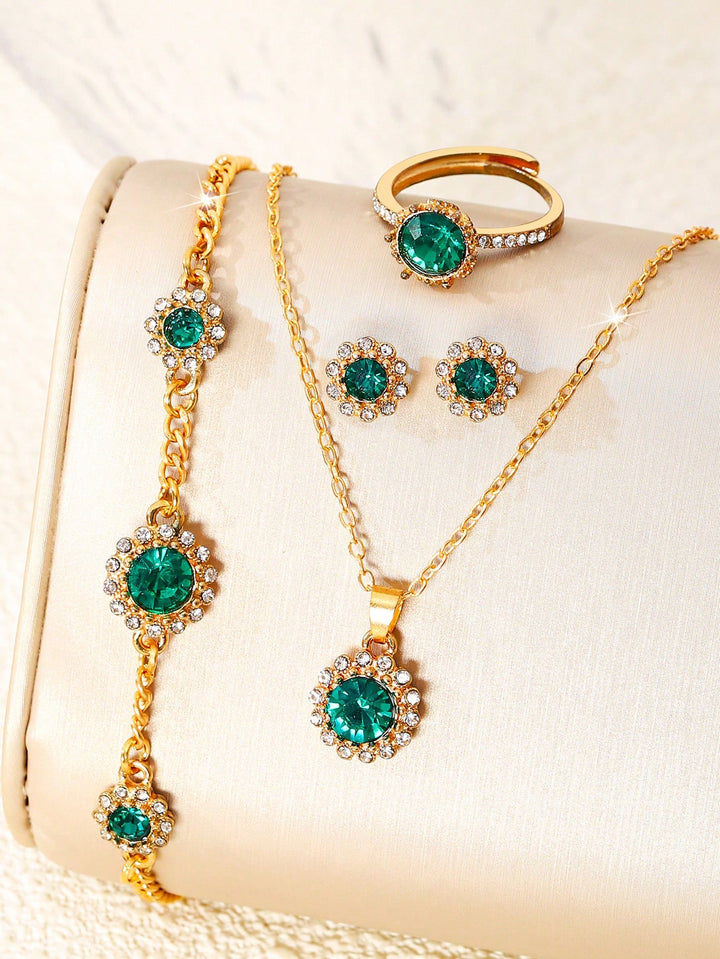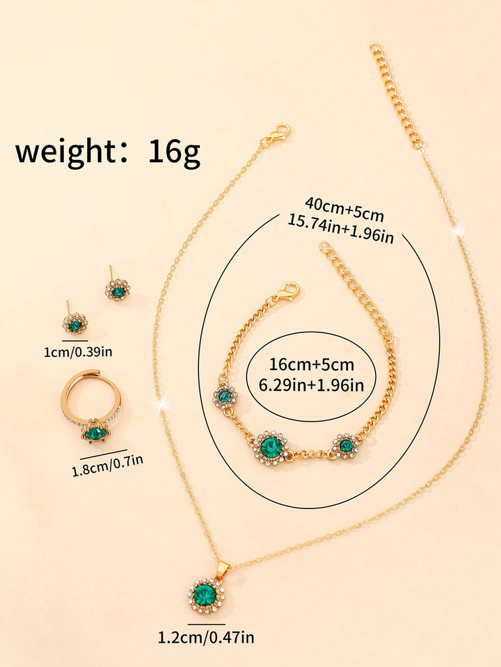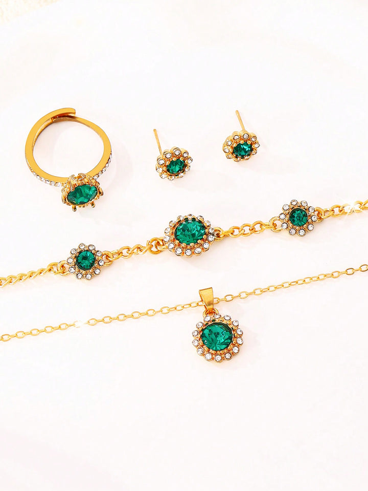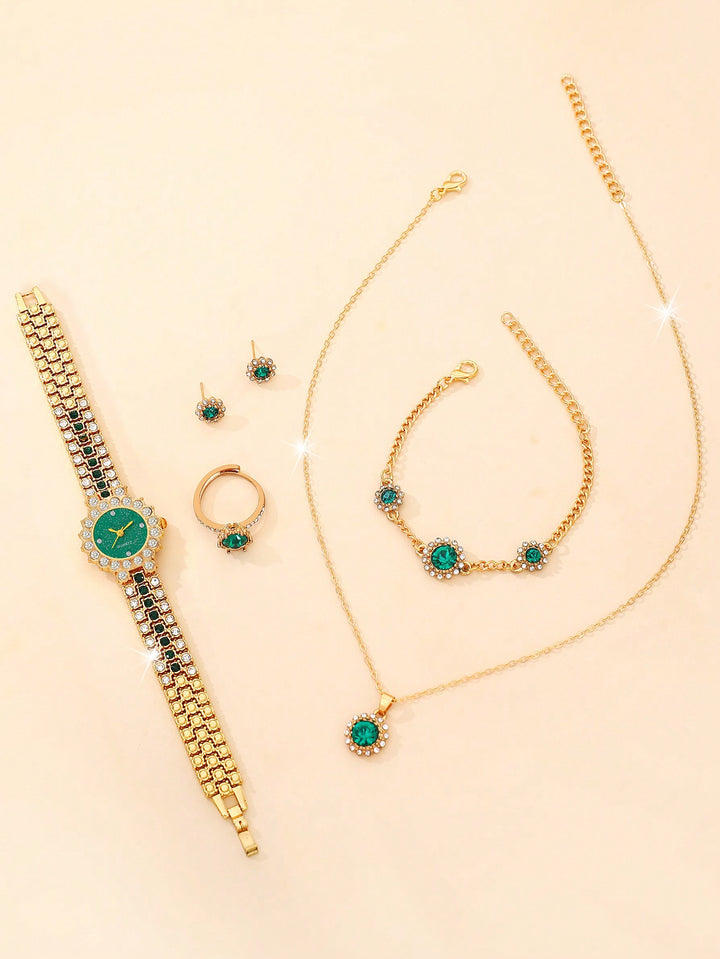 Shein - 6pcs/set Ladies' Green Luxurious Full Rhinestone Quartz Watch And Bracelet Jewelry Set