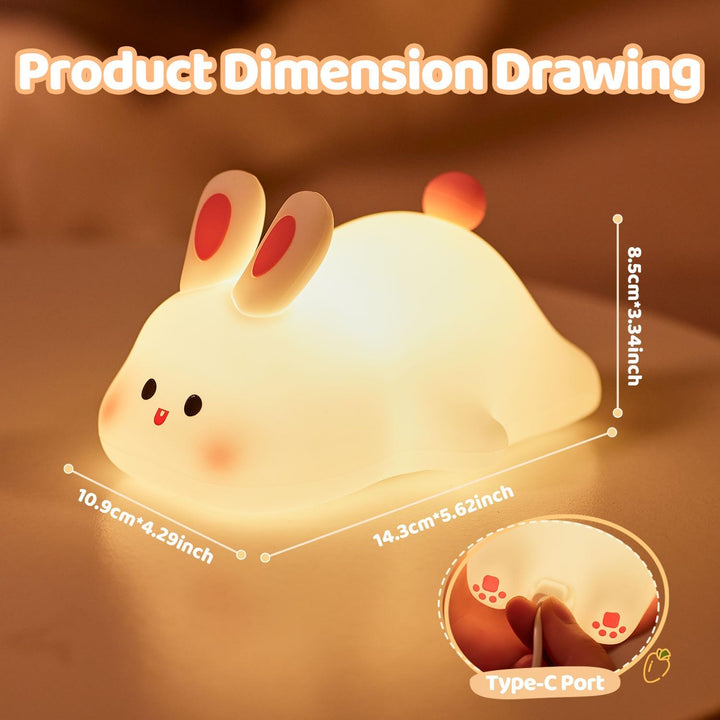 - š The Ultimate Bunny Gift ā Ears Full of Joy Packaged in a pastel gift box, this bunny lamp with floppy ears is a hit for birthdays, Easter, or ājust becauseā moments. People love squeezing the ears and tapping for light, while people appreciate the safety and long battery life. Ideal for bunny lovers of peopleāwhether as a People first night light or a cute desk decor for people. Includes 1x Bunny Night Light, 1x USB-C Cable, and our 24/7 support!