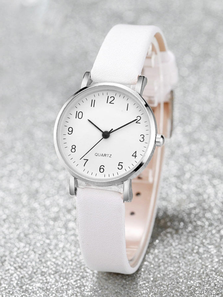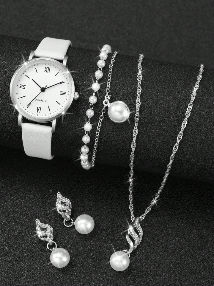 Shein - Ladies' Leather Strap Fashionable Minimalist Numeric Markers Dial Quartz Watch And Jewelry Set (5pcs/set)