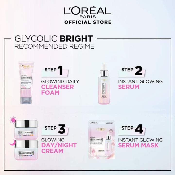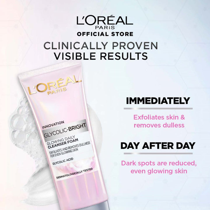 Description: L’Oreal Skincare Laboratories developed Glycolic Bright Glowing Daily Cleanser Foam to gently exfoliate and deeply cleanse skin. With dense creamy foam, thoroughly clears impurities and make-up.  How to use: Apply on wet face and rinse. Avoid eye contour. Volume: 100Ml