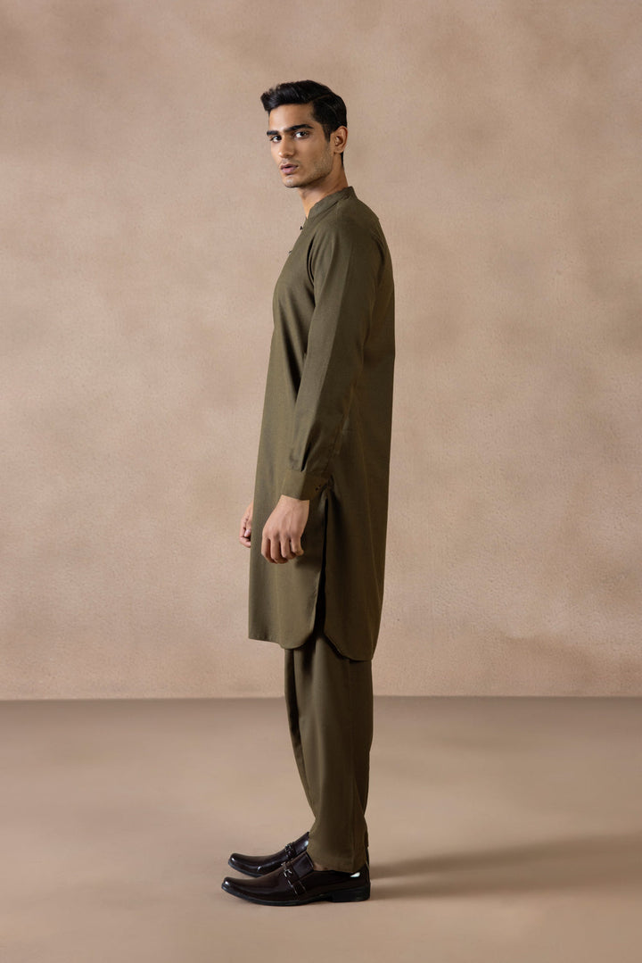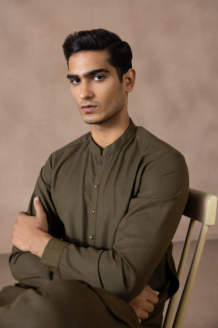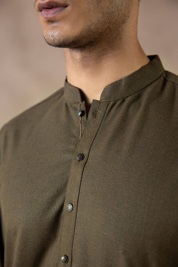 Uplift your style this winter with this rust brown hued two-piece luxury wash & wear ensemble featuring band, cuff sleeves and a matching shalwar.