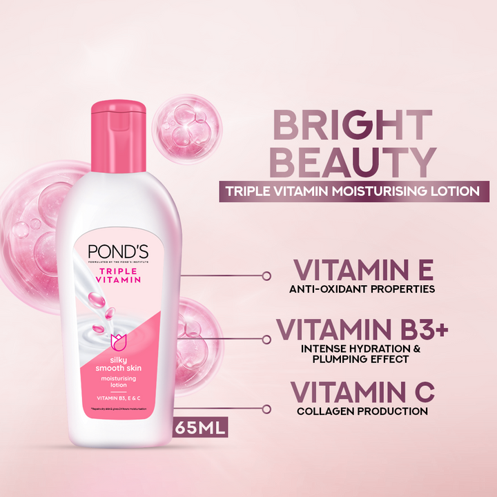 "What It Is: POND’S Triple Vitamin Moisturizing Lotion is a light, non-greasy lotion that gives you silky smooth skin. Its unique formulation is enriched with Triple Vitamin (Vitamins B3, E & C) which renews damaged skin cells from within, giving 3x moisturization.
