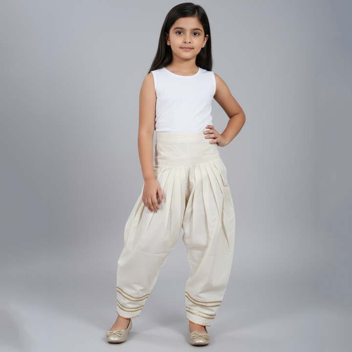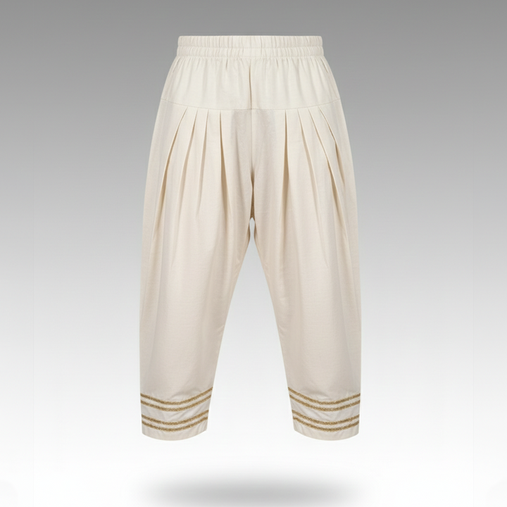 Elevate your ethnic or casual wardrobe with these elegant cream-colored pleated trousers. Designed with a relaxed, loose-fit silhouette, the pants feature an elastic waistband for all-day comfort and easy wear. The front pleats add volume and a stylish drape, while the tapered legs create a flattering shape. Decorative triple-stripe embroidery at the hem adds a traditional, handcrafted touch, making these trousers perfect for festive occasions, cultural events, or everyday comfort with a refined look. Crafted from soft, breathable fabric, they offer both style and ease.