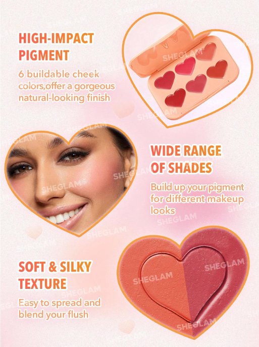 It's time to upgrade your blush routine and add our new SHEGLAM Flush Crush Cream Blush Palette to the mix! Including six heart-shaped cream blushes, this palette offers a gorgeous natural flush effect with the potential to build up your pigment or mix and match shades for different makeup looks! Plus, these blushes feature a silky texture to help you spread and blend your flush like a dream.