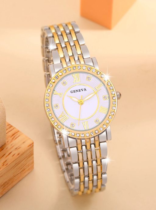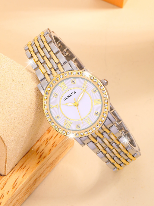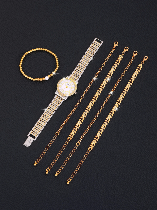 Shein - 1pc Women Zinc Alloy Strap Glamorous Rhinestone Decor Round Dial Quartz Watch & 5pcs Bracelet, For Daily Decoration
