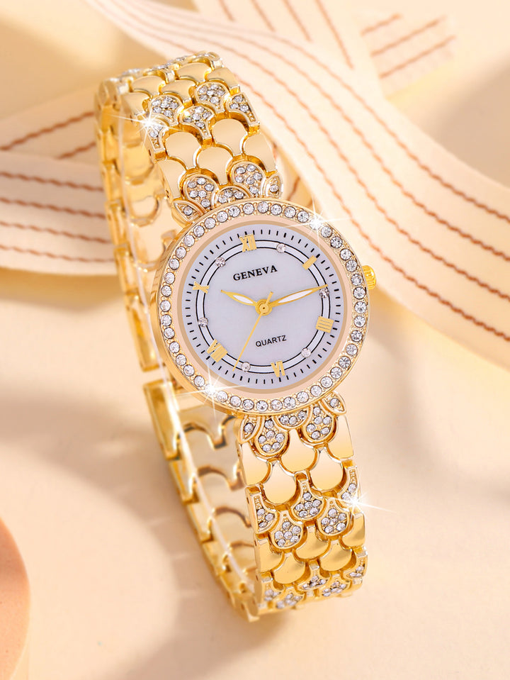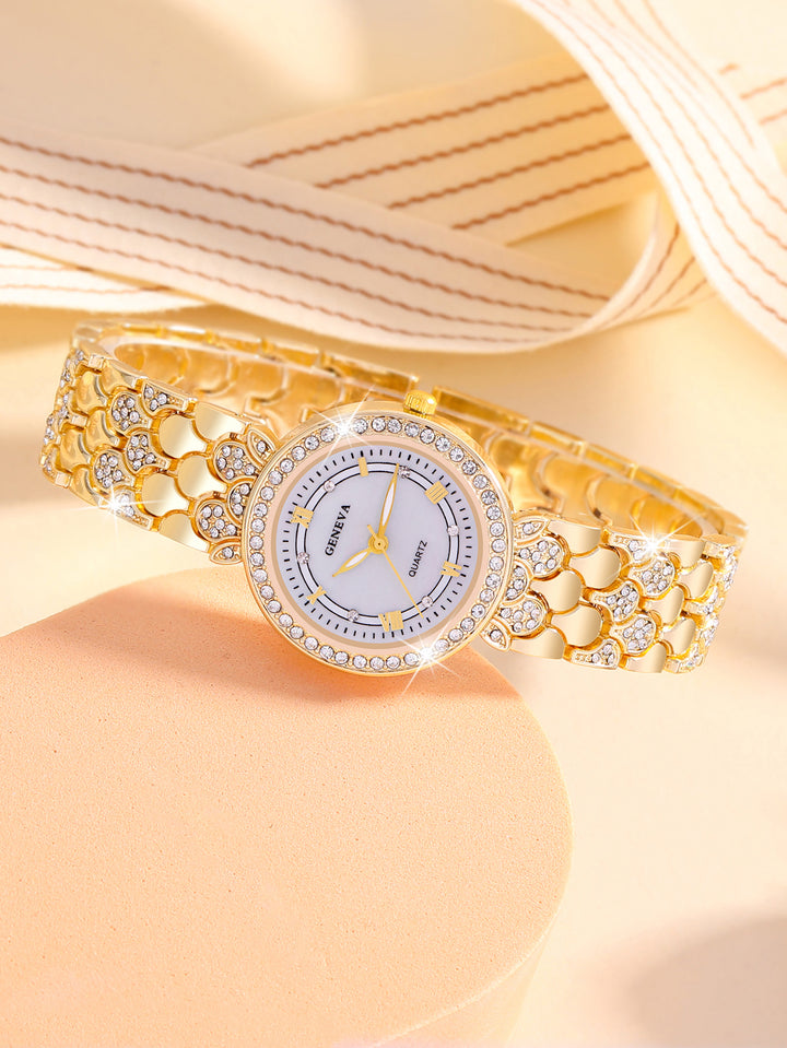 Shein - 1pc Women Zinc Alloy Strap Glamorous Rhinestone Decor Round Dial Quartz Watch & 5pcs Jewelry Set, For Daily Decoration
