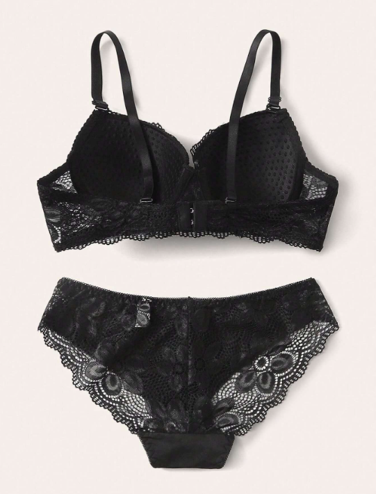 Shein 1Set Fixed Double Shoulder Straps & Rear Button With Non-Removable Cup Pads, Lace Trim, Underwire & Comfortable Bra With Triangle Panties
