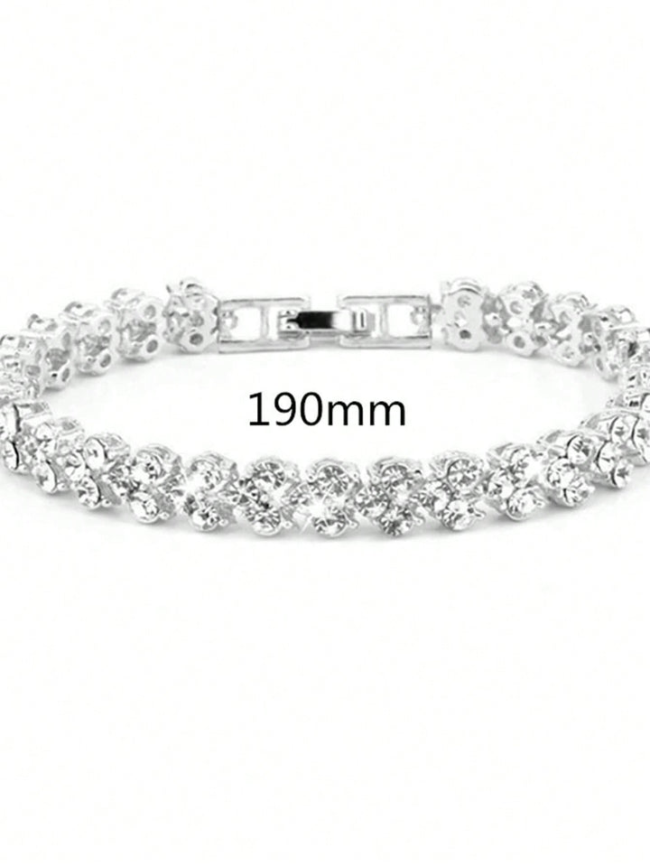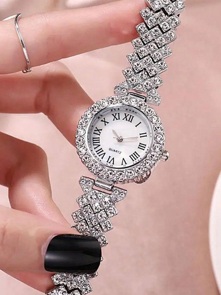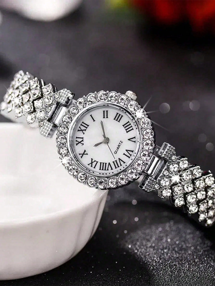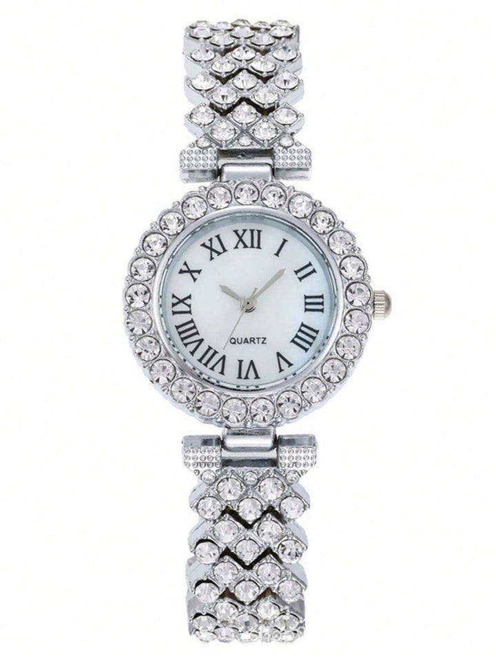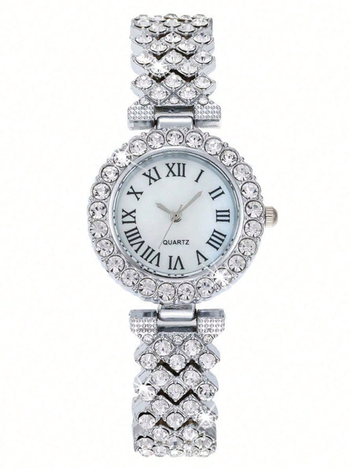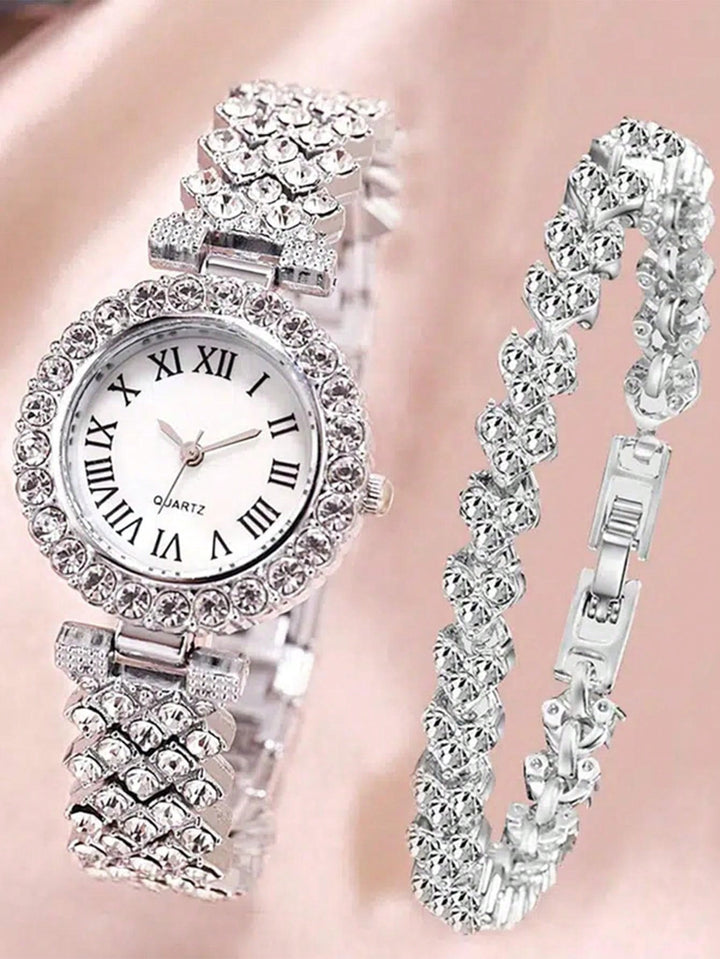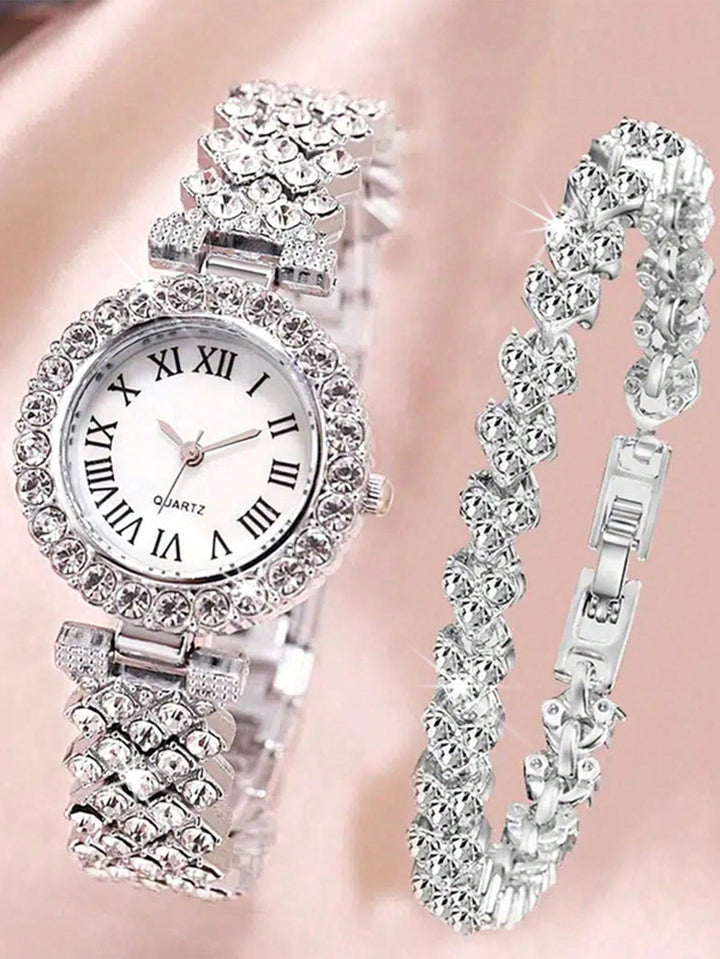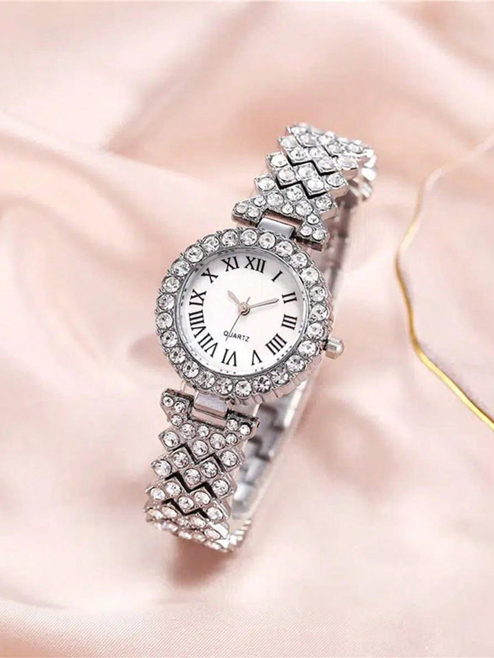 Shein - 2pcs Ladies Roman Numerals & Rhinestone Decor Quartz Watch And Heart Charm Bracelet Set
