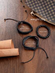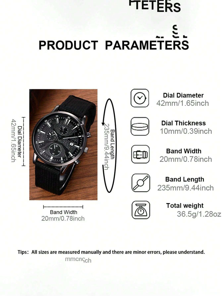 Shein - Men Watch 1pc Men's Black Nylon Strap Casual Industrial Style Round Dial Calendar Pointer Quartz Watch And 3pcs Bracelets Set