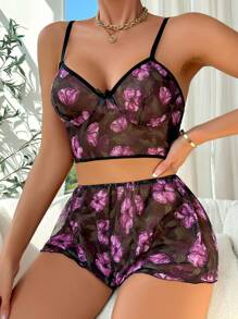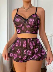 Shein - SHEIN Floral Print Metallic Ring Mesh Lingerie Set