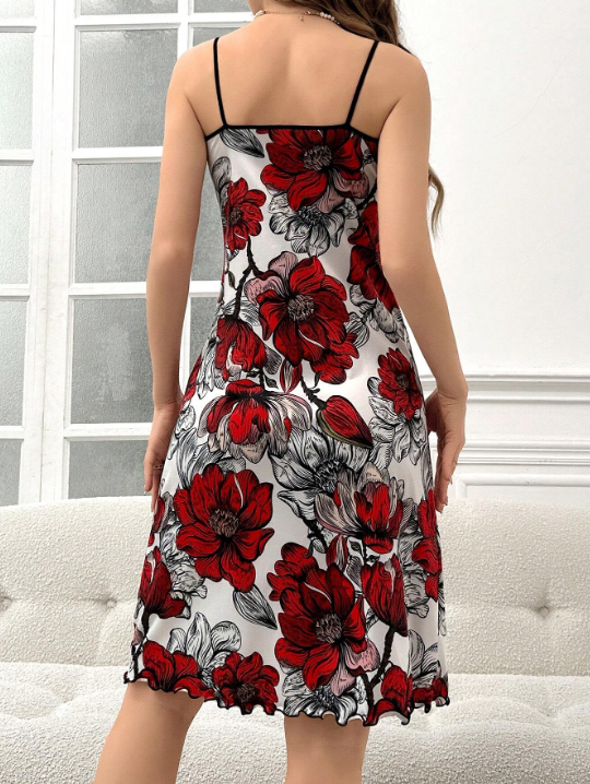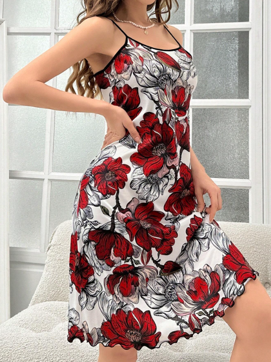 Shein - Women'S Rose Pattern Frill Trim Fashionable And Comfortable Camisole Sleepwear Nightgown