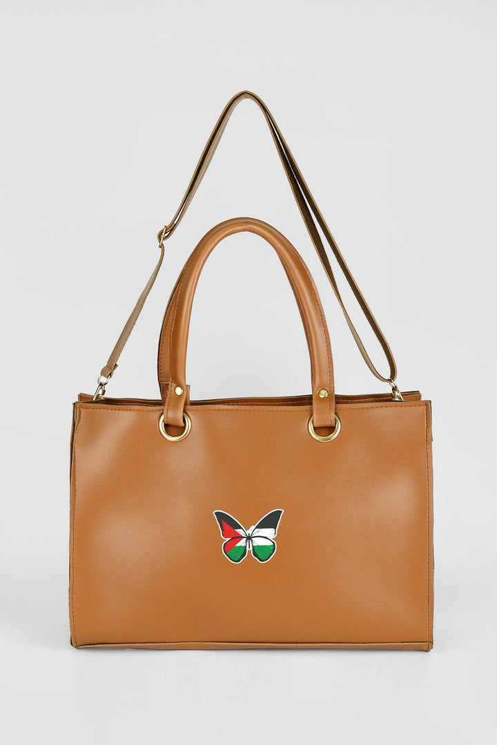 This tote bag makes a powerful statement with its stunning butterfly design. The butterfly's wings incorporate the colors of the Palestinian flag, creating a unique and meaningful symbol of hope and solidarity. The bag is crafted from high quality synthetic leather and its spacious design makes it perfect for carrying all your everyday essentials.