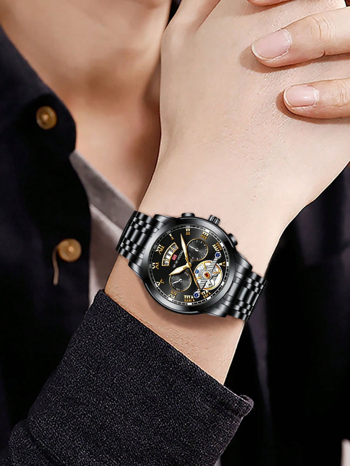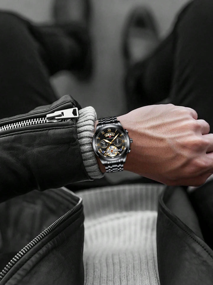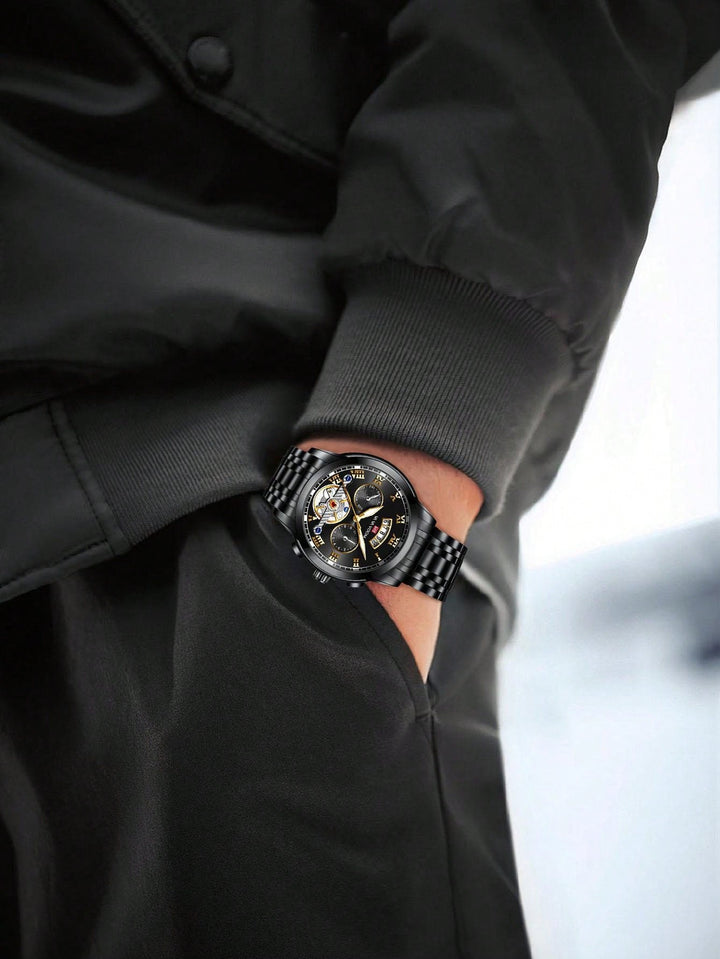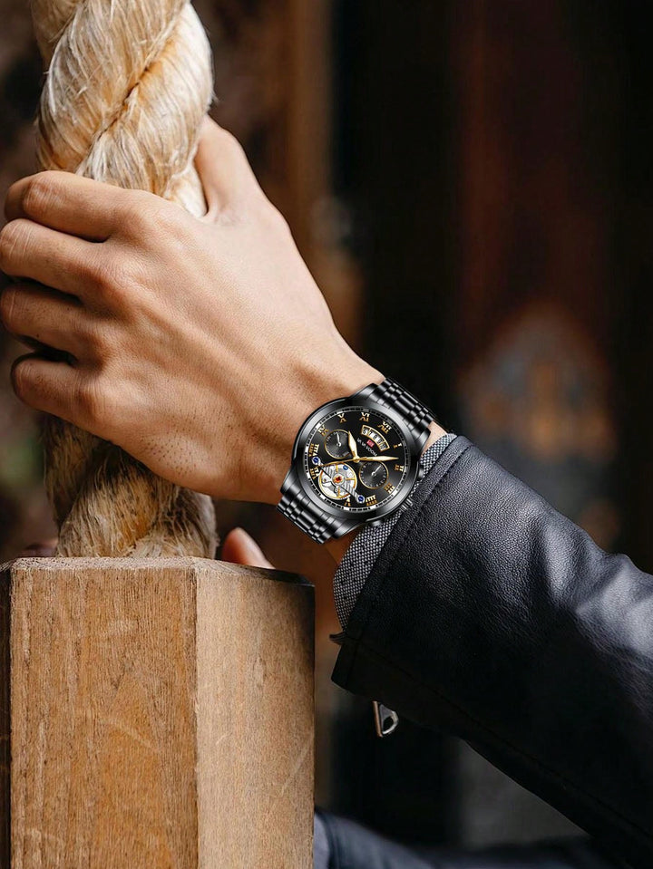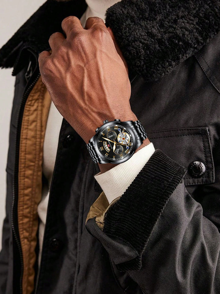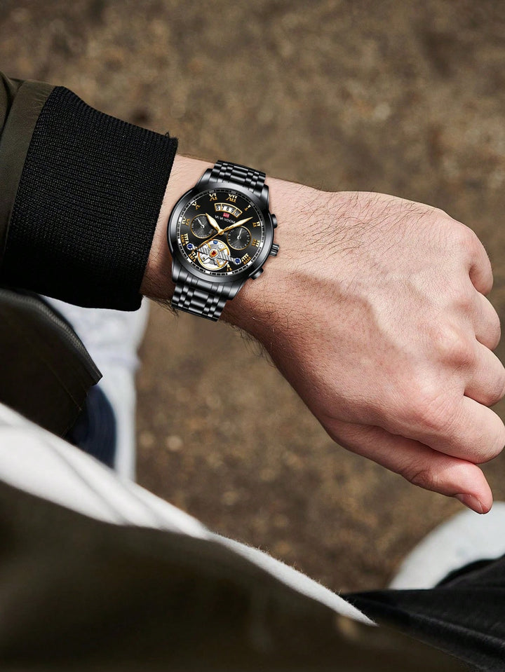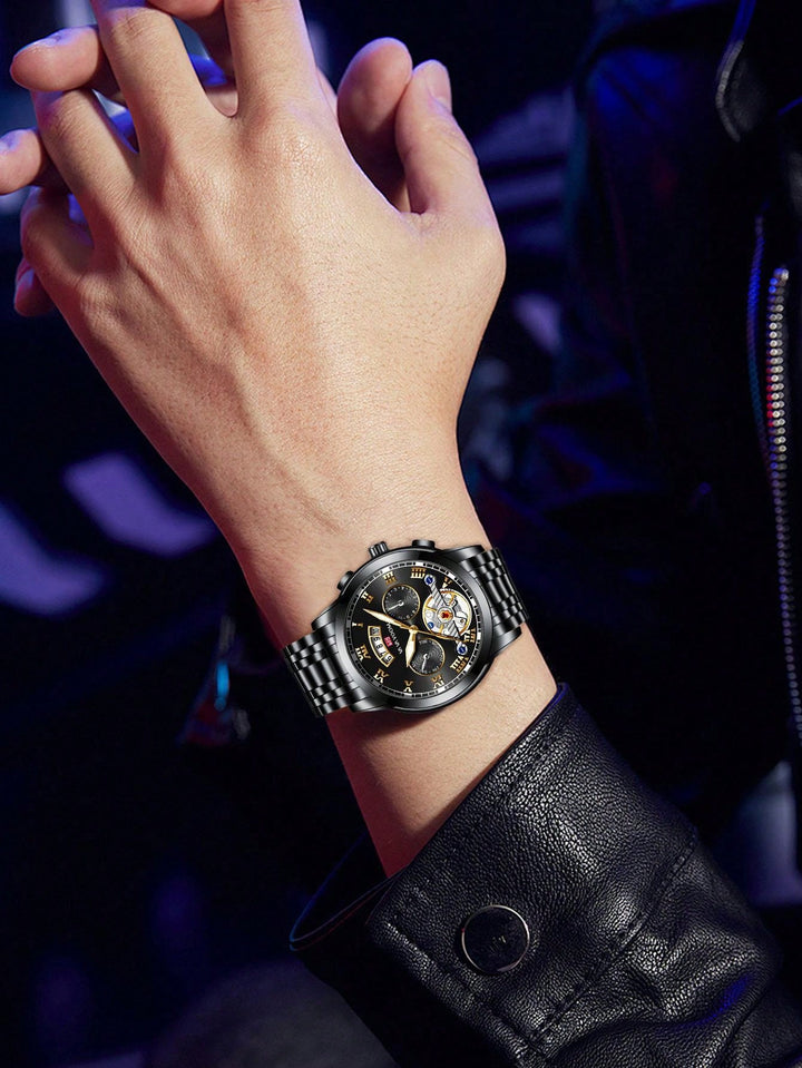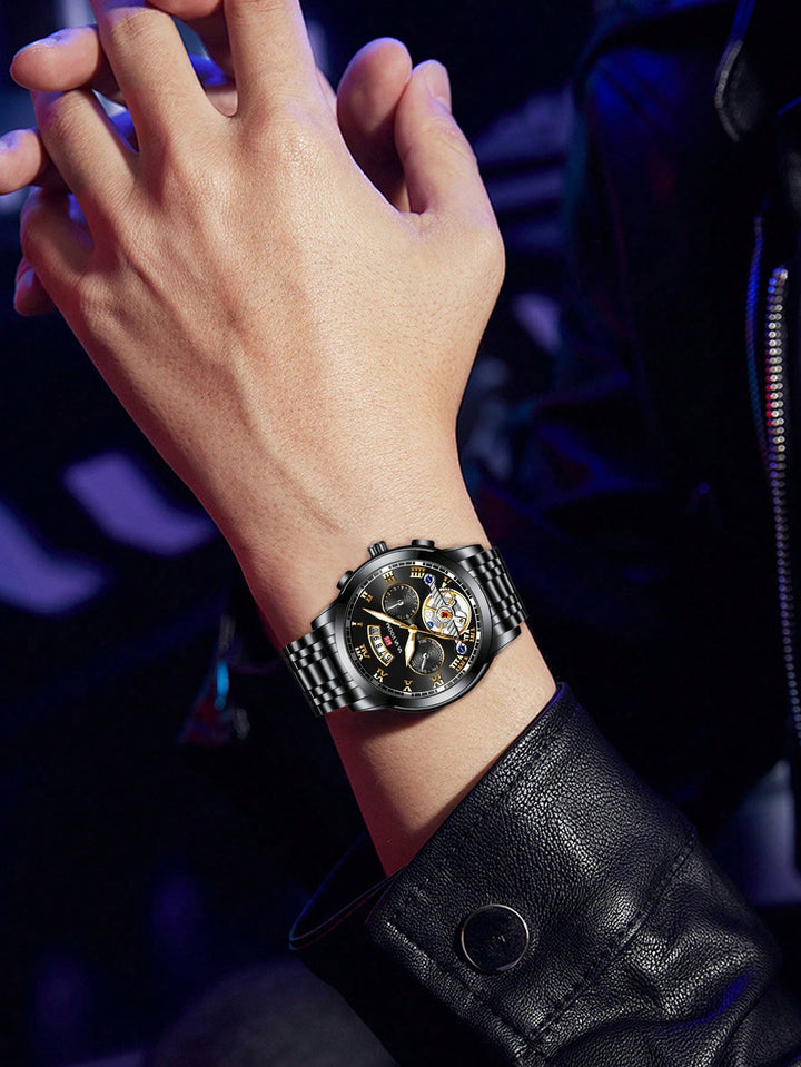Shein - Va Va Voom 2023 New Men Silver Stainless Steel Analog Tourbillon Luminous Calendar Waterproof Sports Watch
