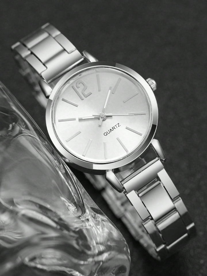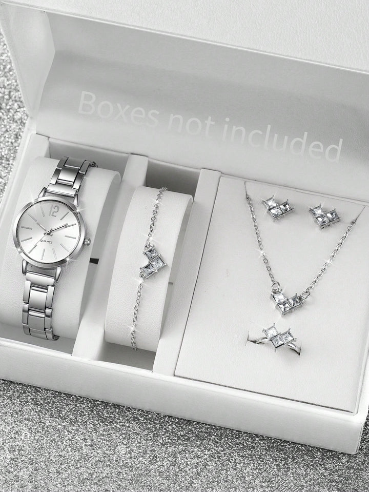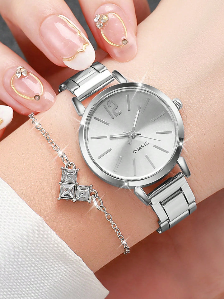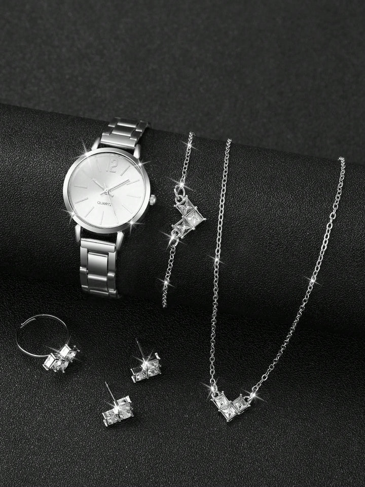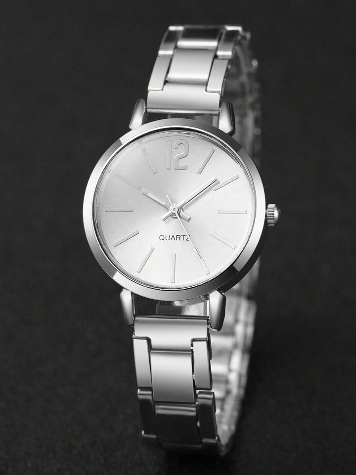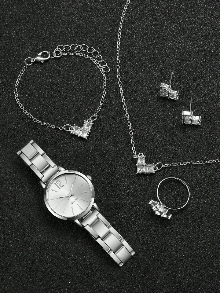 Shein - Women's Stainless Steel Strap Fashionable Minimalist Small Dial Quartz Watch + Heart Shaped Jewelry Set (6pcs/set)